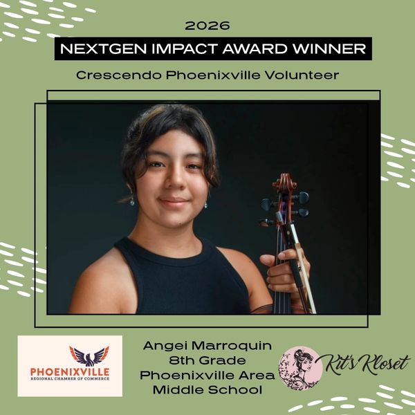 Congratulations to Angei Marroquin the 2026 Phoenixville Chamber of Commerce NextGen Impact Award for her volunteerism with Crescendo Phoenixville. She will be honored on March 18th 2026 at the Chamber's annual awards dinner. This award is given in the spirit of community organizing and celebrates the impact of youth efforts!